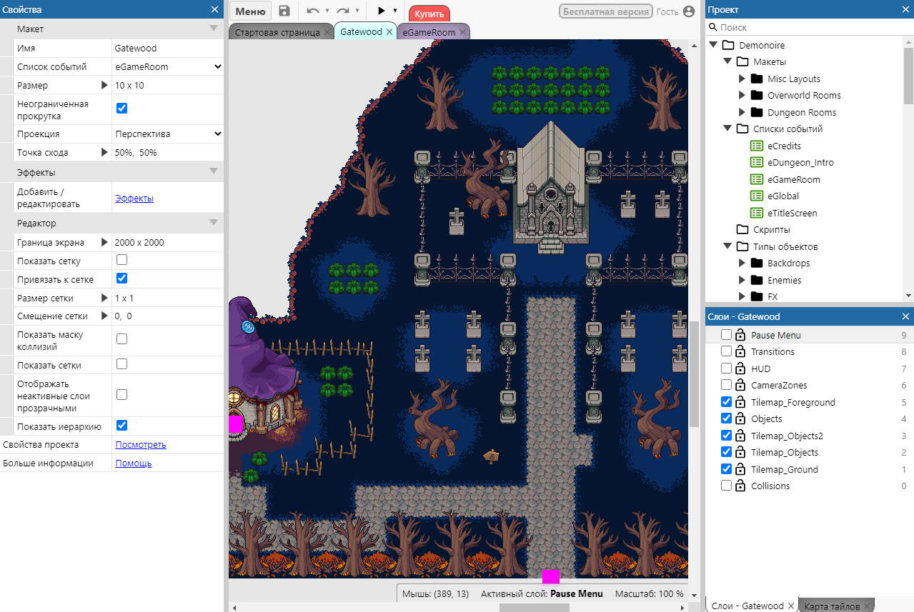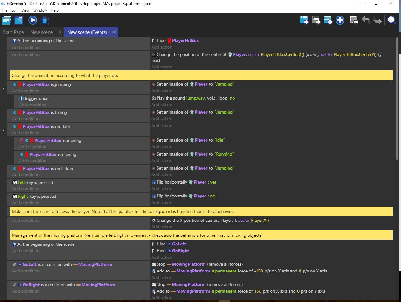 GDevelop позволяет создавать игры без написания сценариев. Логика представлена здесь в виде графических алгоритмов, которые привязываются к событиям. Вы можете публиковать свои игры в Интернете, создавать игры для мобильных устройств с iOS и Android, публиковать в Steam, Facebook, Itch.io, Newsground, в Windows Store. Но при необходимости можно расширить возможности игры с помощью JavaScript.