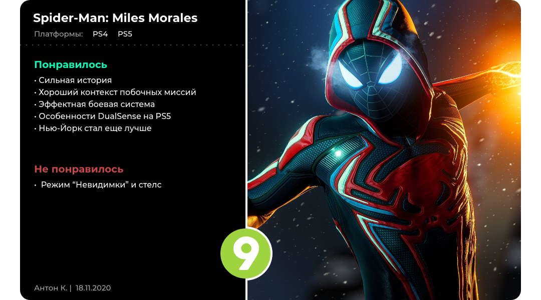 Для тех, кто собирается брать PS5, не важно, себе или в подарок, я бы рекомендовал Spider-Man: Miles Morale как самый комплексный тайтл, который найдет отклик в сердце у большинства