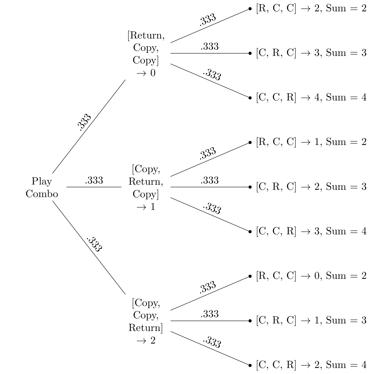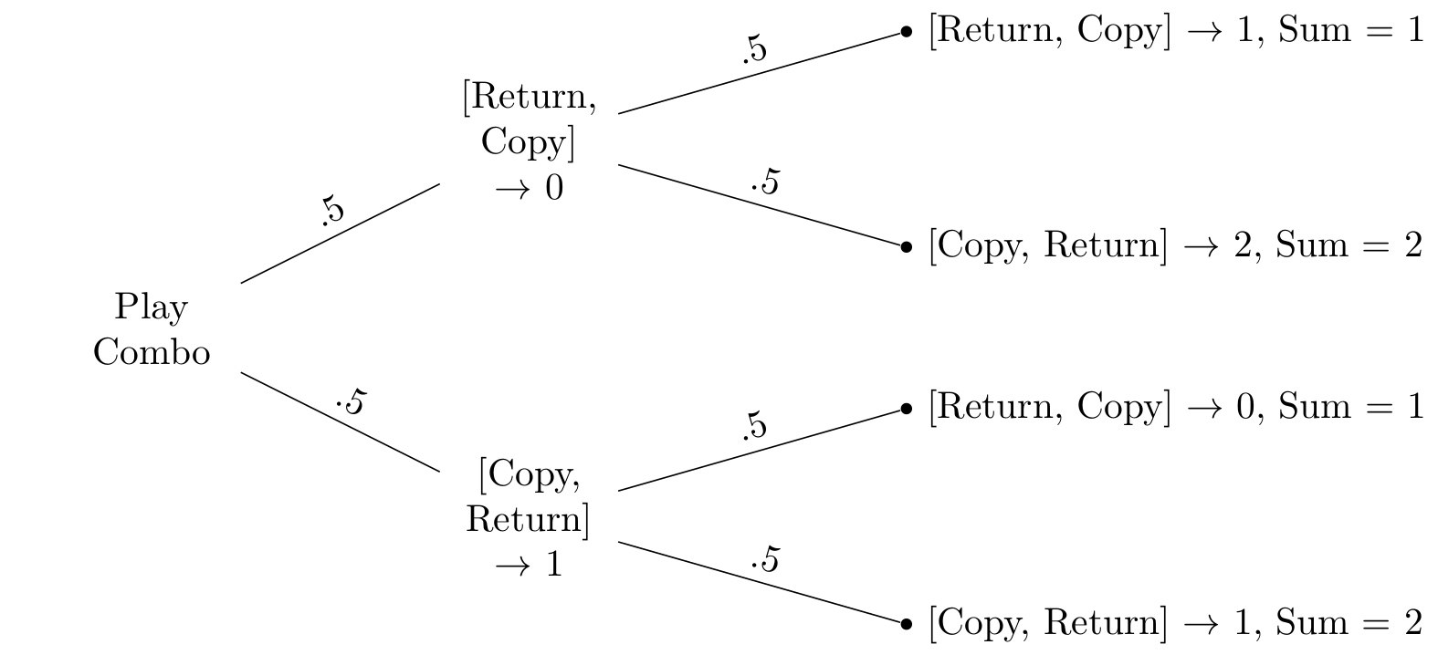 Each of the two levels represent the possible sequences of battlecries that were triggered each time Shudderwock is activated with Return used for the Grumble effect and Copy used for the Chain Gang effect. They’re labeled to also show the number of additional Shudderwocks yielded by that sequence. At the second level, we also consider the board state that was left behind from the first level, which is why the topmost path has the same sequence, , twice but the second level yields one from the copy leftover from the previous level. Finally, the sums of all the Shudderwocks on both levels are included to see the end outcomes from playing the combo: we can expect to get either one or two Shudderwock copies and 1.5 copies on average. We could also just look at the first level to see the outcomes of playing Shudderwock by itself: we can expect to get either zero or one Shudderwock copies and 0.5 copies on average.
