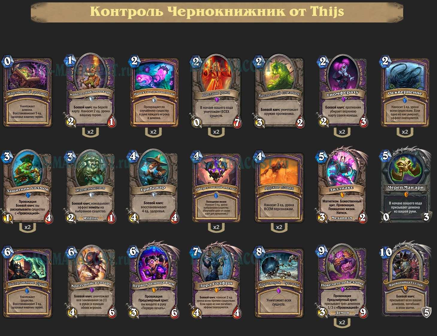 Вышеприведенная сборка от Thijs прежде всего направлена испортить план на игру противникам при помощи Кровопийцы Гул’Дана, Крадущегося упыря, Гномферату, Лорду Годфри, Зилликасу, Первоученицы Рин и конечно же Проекта по демонологии. Представленному выше Контроль-Чернокнижнику не страшны комбо архетипы и как не странно, он также силен в обороне из-за классического набора Череп Ман’Ари, плюс Повелитель Бездны.