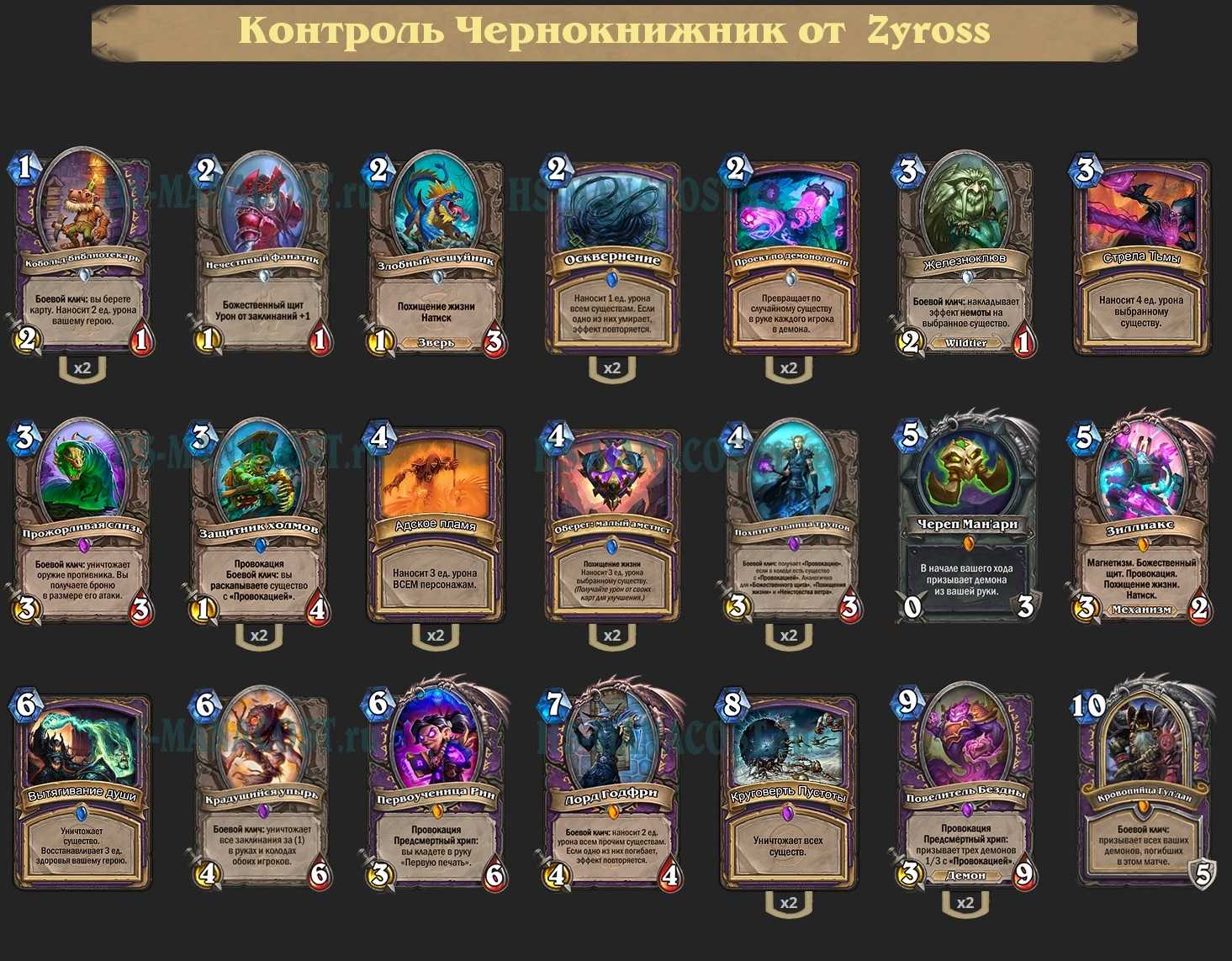 В случае если вы на полях сражения встретились со своим классом, то одолеть Чернокнижника вам помогут: Осквернение, Кобольд-библиотекарь, Жертвенный договор, Череп Ман’Ари, Адское пламя. Если вам достался Череп Ман’Ари найдите к нему в пару Повелителя Бездны.