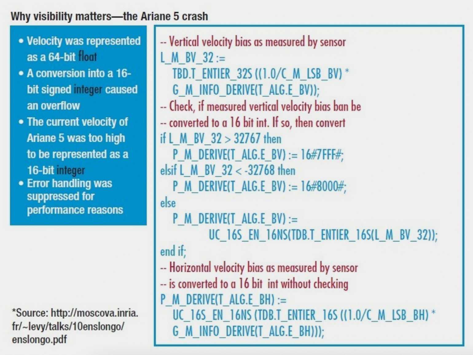 Скопированный программный модуль неверно прочитал ситуацию и преобразовал 64-битное значение в 16-битное безо всякой проверки. Да, программа перехватила исключение — а вот отреагировала на него неадекватно и отправила на бортовой компьютер сигнал аварийного завершения. При этом с технической точки зрения полёт был абсолютно нормальным.