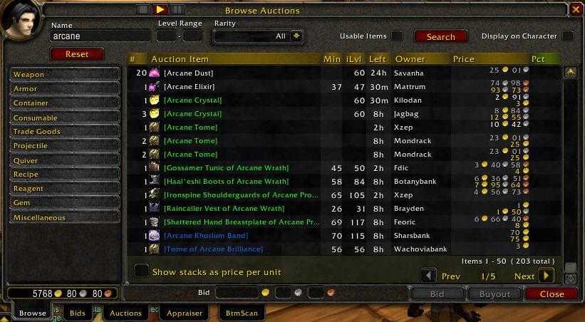 Если вы активно торгуете на аукционе, «Auctionator» станет вашим лучшим другом. Он упрощает процесс размещения и поиска предметов на аукционе, предоставляет информацию о ценах и истории продаж, а также позволяет создавать списки покупок и отслеживать изменения цен.