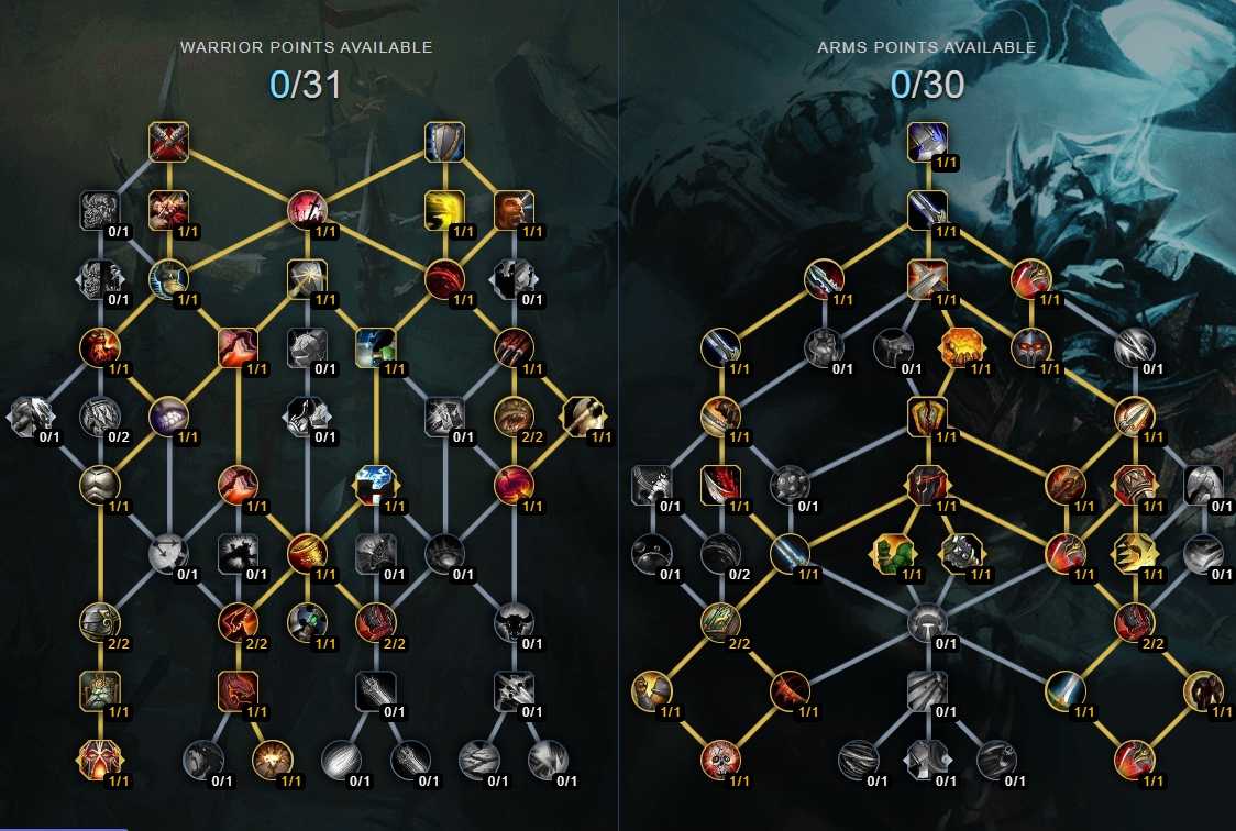 Ниже представлен билд талантов класса Воин, Оружие, составленный по данным SimulationCraft. Существует множество вариантов эффективных комбинаций талантов, здесь представлена наша рекомендация, которую редакция считает оптимальной. Тем не менее, рекомендуется изучить каждую из составляющих прежде, чем использовать билд, а тем более менять его. Сперва нужно понять сильные и слабые стороны вашего персонажа — это самый верный путь для составления эффективного билда.