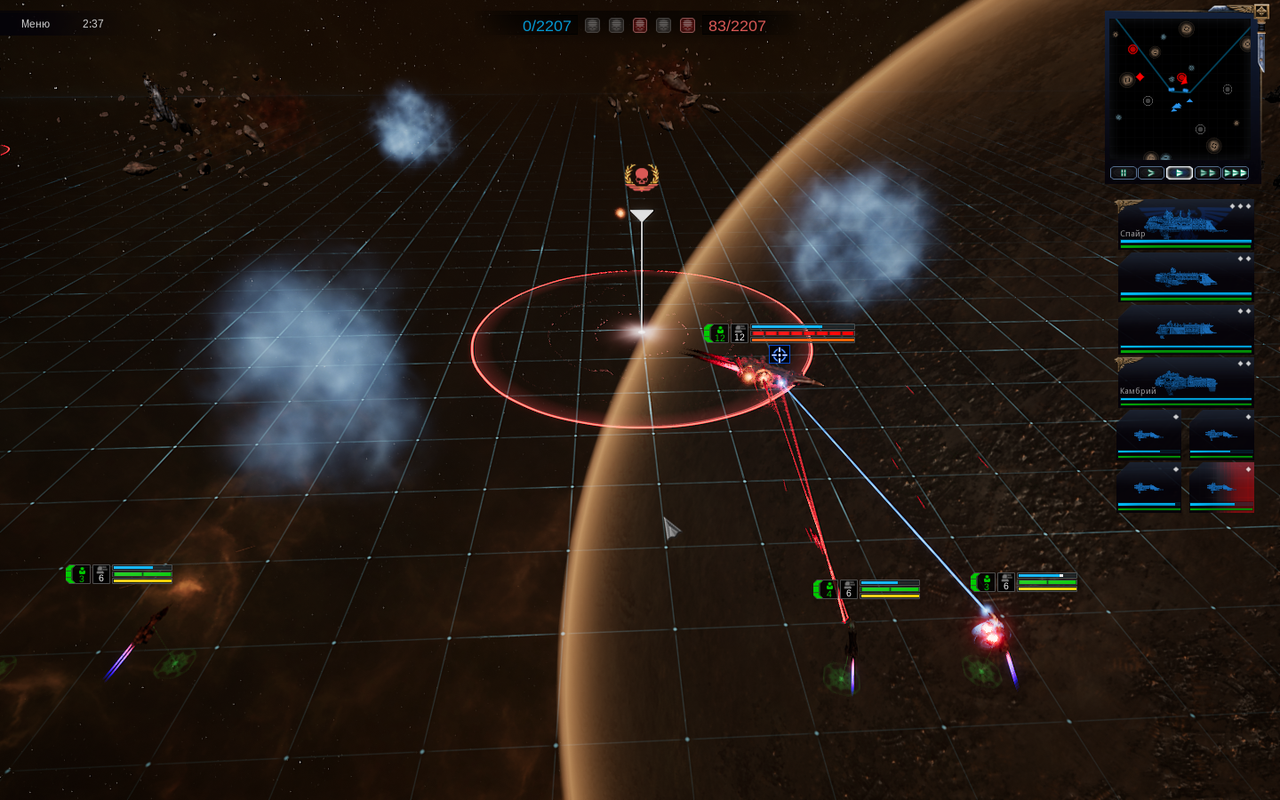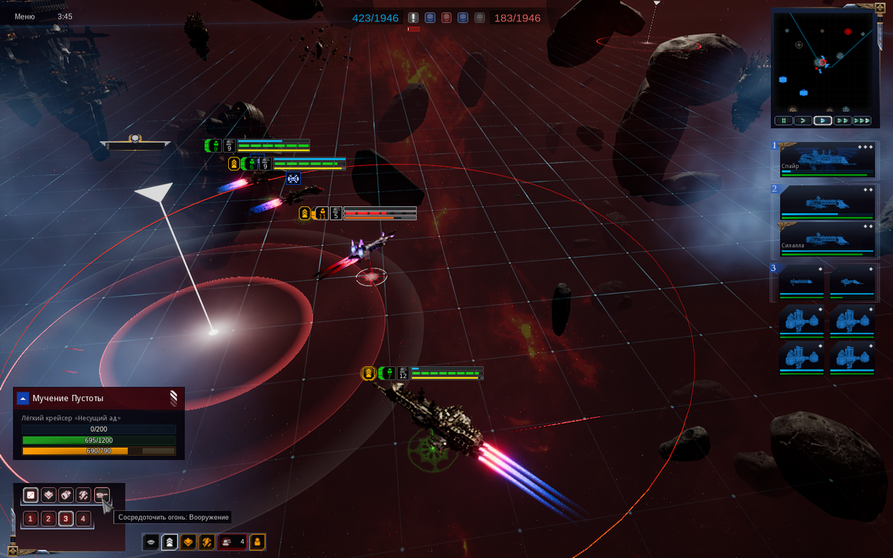 В целом, суть всех сражений заключается в том, чтобы грамотно использовать все способности всех кораблей. А чтобы делать это максимально эффективно, придётся не забывать о времени их перезарядки. Скажем честно – обычному игроку будет довольно трудно ориентироваться во всех этих способностях, когда в его флоте 4-6 кораблей, не говоря о больших количествах, и не забывать вовремя использовать нужные. К счастью, в игре есть режимы замедления времени и активной паузы, которые помогут раздать все приказы вовремя.