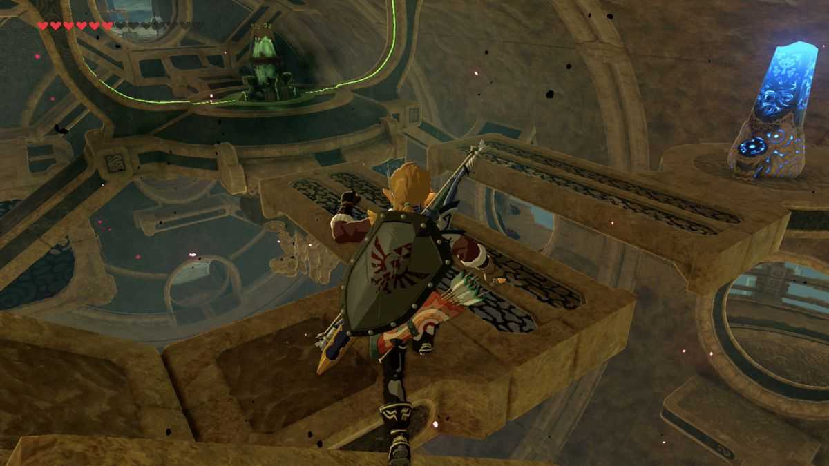 Walk straight past the apparatus in the hallway, turn right and jump off the ledge. Use your paraglider to swing left and float down to a platform that’s just below where you walked in above. There, you’ll find a treasure chest with an ancient core. (Fun fact: This is the treasure chest you can see from the map room.)