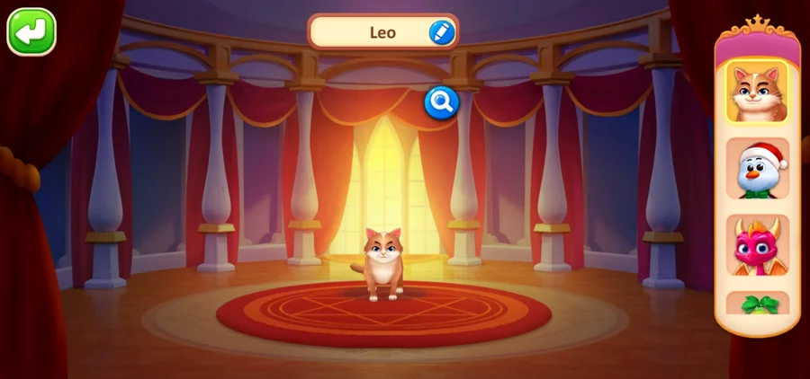 Питомец. Является питомцем вашей главной героини, с первым питомцем котом по имени Лео, вы познакомитесь, проходя сюжетные задания. Для него вы установите предметы обихода и лежанку. Ваш питомец будет гулять по замку и с ним могут быть связаны некоторые задания. В меню питомцев вы можете поменять имя на желаемое и приобрести других питомцев, за золотые монетки.