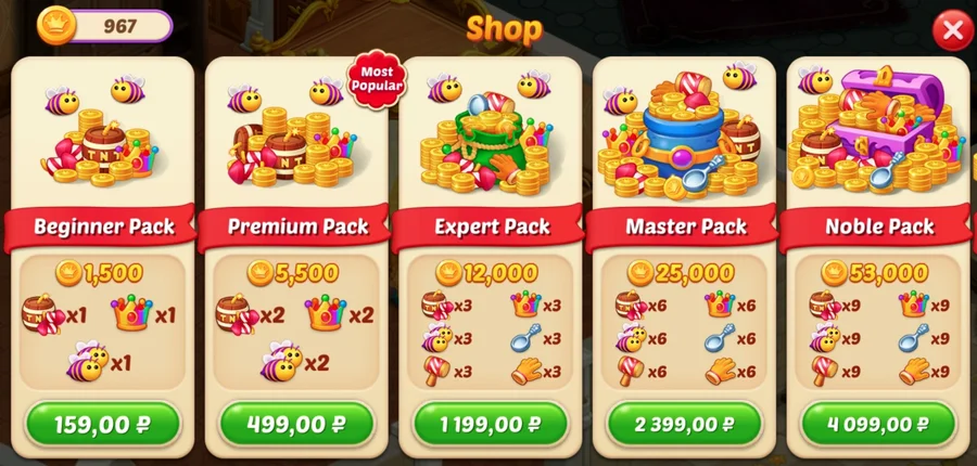 - Набор эксперта — В составе набора 12000 монет, 3 динамита, 3 ракеты, 3 короны, 3 пчелы, 3 ложки, 3 волшебных молотка, 3 перчатки.