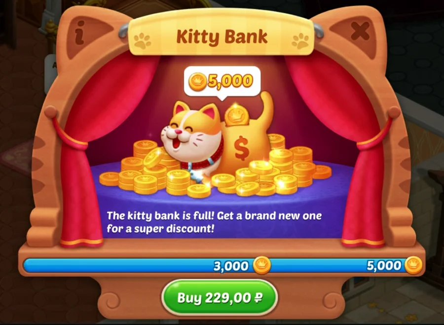 Копилка кошка. Является прекрасным способом добыть дополнительное количество монет. Копилка может копить дополнительные монеты, за каждый успешно пройденный вами уровень. Для того, чтобы воспользоваться копилкой вам необходимо приобрести к ней доступ за реальные средства. Вложение в копилку оправдано, так как она многоразовая и после того, как вы заберете, накопленные монеты, копилка накопит монеты снова.