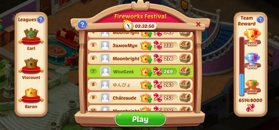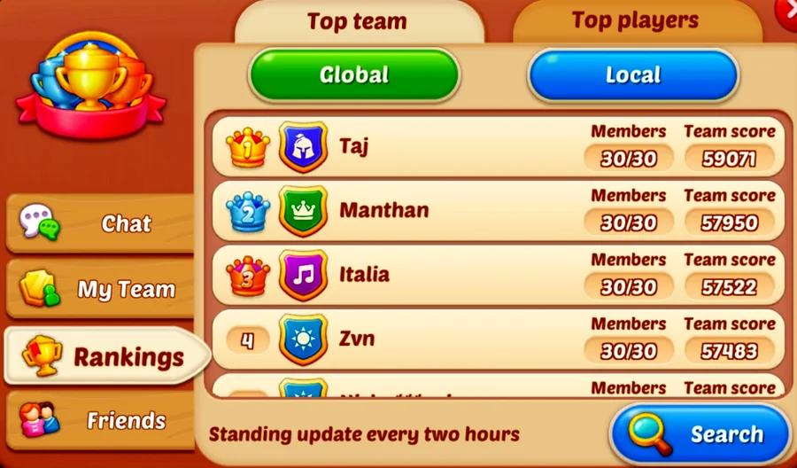 Турнирная таблица команд. У каждой команды есть очки, которые суммируются и получаются с помощью членов команды. Каждый член команды может внести свой вклад, помогая своим друзьям в команде откликаясь на их зов помощи и проходя новые уровни. Никаких подарков не предусмотрено для лидеров этой таблице, но ваша команда может испытывать гордость, за лидирующую позицию.