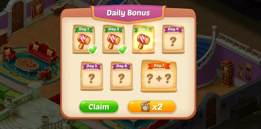 Награды каждый день. При первом входе в игру запускает событие «Награды каждый день». Окошко события появляется один раз в день, при первом входе в игру. Вы можете забрать полезные награды сразу или посмотрев рекламу удвоить их количество. В начале идут менее ценные награды, далее уже ценнее и самый лучший подарок, будет подарен на 7 день входа в игру.