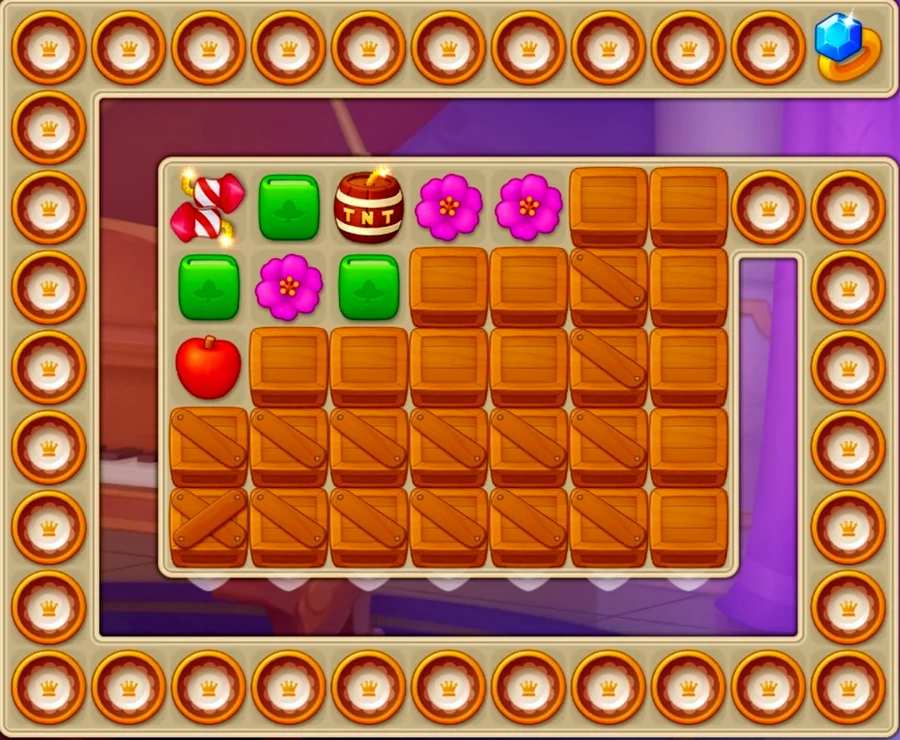 Игровое поле. На игровом поле находится головоломка текущего уровня. Игровое поле может отличаться в каждом уровне, менять геометрическую форму, может быть разбито сразу на несколько форм и так далее. Каждый уровень уникален и будет отличатся, от предыдущего. Также и увеличивается уникальность уровней, периодически на новых уровнях будут появляться новые элементы, цели и так далее.