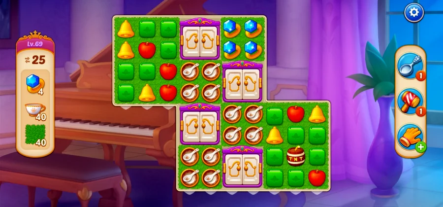 Ложка разрушает один элемент, выбранный вами, волшебный молоток разрушает одну колонку и один ряд вместе с элементами. Перчаткой вы можете поменять предметы местами, сместив их.