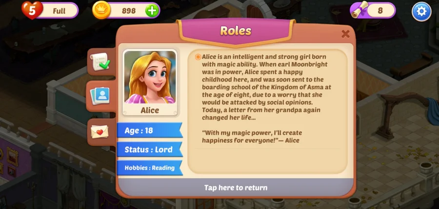 Раздел персонажей. По мере прохождения глав и сюжета в игре, вам откроются новые персонажи. Одни будут друзьями вашей героини, другие будут врагами. О каждом персонаже в игре есть подробная информация, которую вы можете прочесть в этом разделе. Информация содержит имя и даже возраст героя, также вы можете прочесть небольшую историю жизни героя.