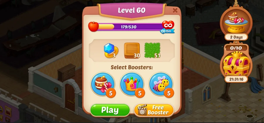 В меню уровня отображается его номер, который вам необходимо пройти. Цели уровня, которые вы должны обязательно выполнить, без выполнения определенных целей уровень будет не пройден. Чуть ниже отображаются бустеры и их количество, бустеры вы можете использоваться для успешного прохождения уровней. В правой части меню отображаются текущие события в игре, при выполнение которых вы получаете бустеры и бонусы.