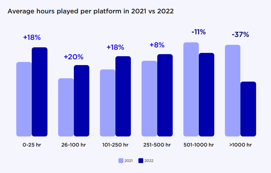Стало гораздо меньше пользователей, проводивших за играми в год более 1000 часов (падение на 37%), и пользователей, тративших на игры в год от 501 до 1000 часов (падение на 11%). Соответственно, стало больше тех, у кого иные игровые привычки.