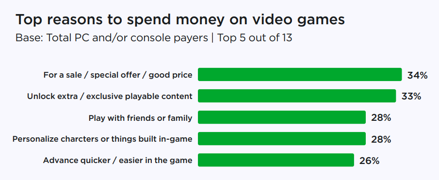 Самый распространенный повод к совершению покупки (именно игры) — распродажа или специальное предложение (34%), также для многих важно получить дополнительный контент (33%)