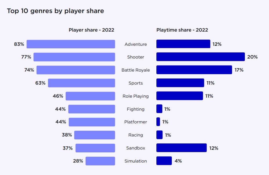 Однако, если взять все проведенное время в играх за год за 100%, то наибольшая доля придется на шутеры (Shooter) — 20%. На втором месте будут королевские битвы (Battle Royale) c 17%.
