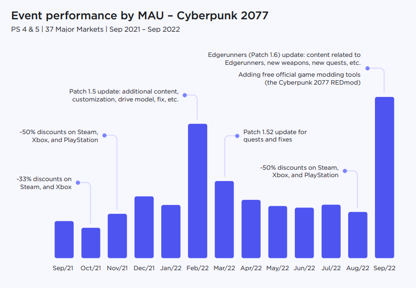 Сложнее оценивать влияние факторов на MAU Cyberpunk 2077.