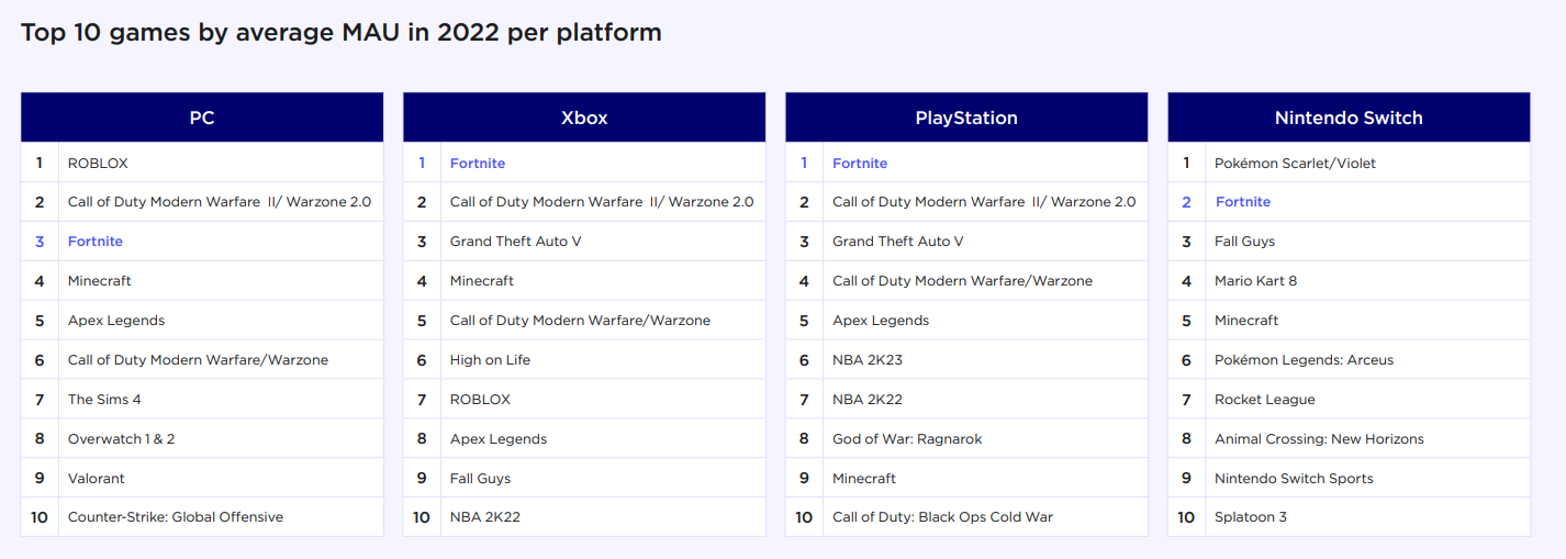 У каждой платформы есть свой топ игр по среднему MAU. В «призовой тройке» каждого из них находится Fortnite.
