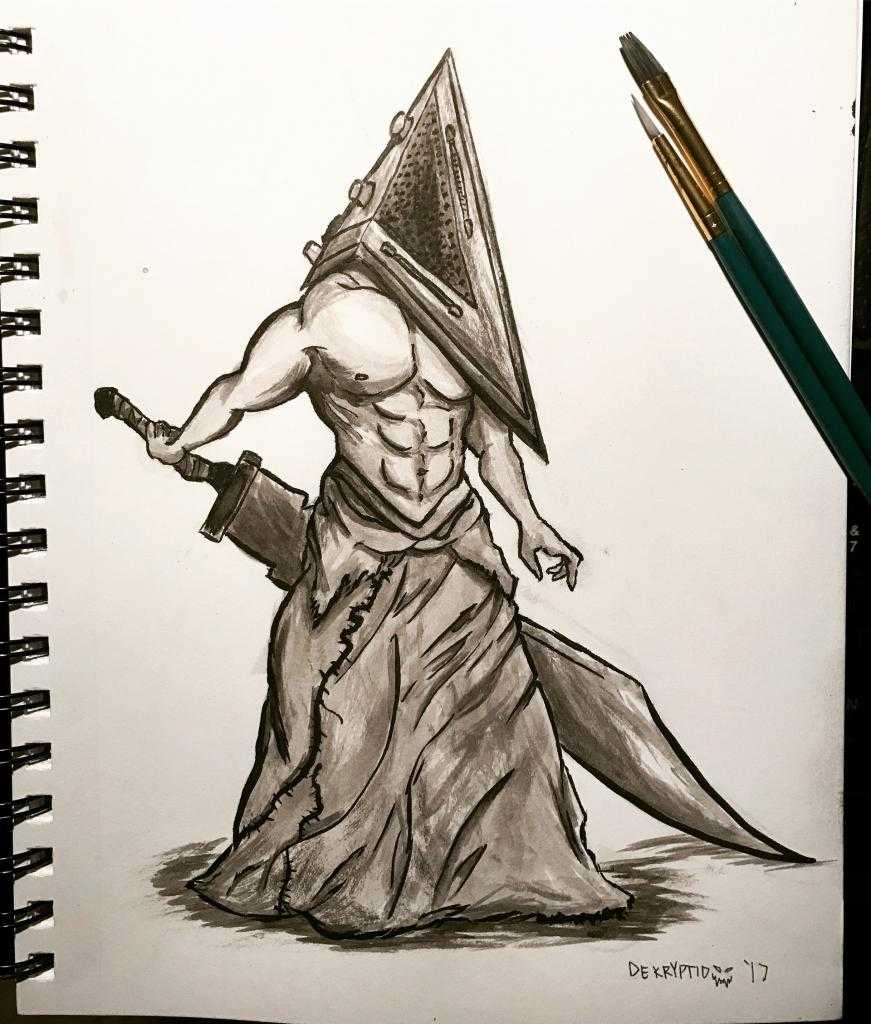 Перенести монстра на бумагу человек может за 20 минут. В изображении нет ничего сложного. Работать в самом начале лучше карандашом. Как нарисовать пирамидоголового из «Сайлент Хилл» поэтапно: