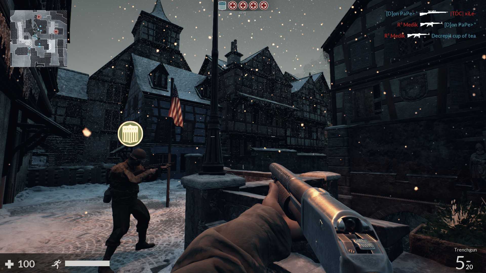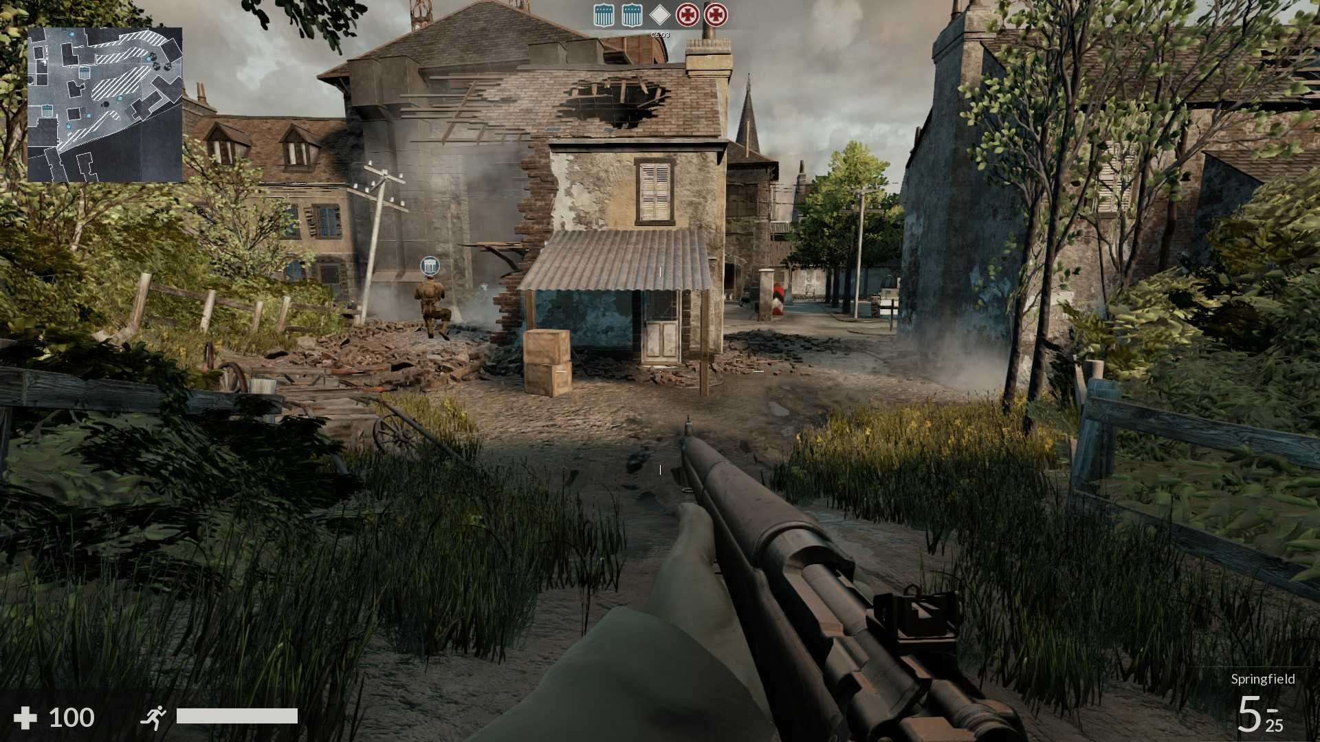 Бои происходят на разного масштаба витиеватых картах. Сейчас это в основном городские локации и серый пляж Омаха. Внешность, правда, обманчива, и даже на первый взгляд масштабные карты — это много длинных коридоров, причем иногда в несколько уровней. Даже попав на пляж, все равно много времени проводишь в траншеях. Не то чтобы это плохо, но нужно быть готовым к тому, что бодрой войны наверняка не будет. Снайперы рулят. В каждом втором матче, куда я заходил, велась жесткая позиционная война. На некоторых городских картах есть точки, где сплоченная команда из снайперов и прикрывающих может сидеть очень долго. Их реально взять только спланированным штурмом и задавить количеством — и то не факт, что сработает. Умирают здесь быстро — хватает одного-двух попаданий из чего угодно и куда угодно.