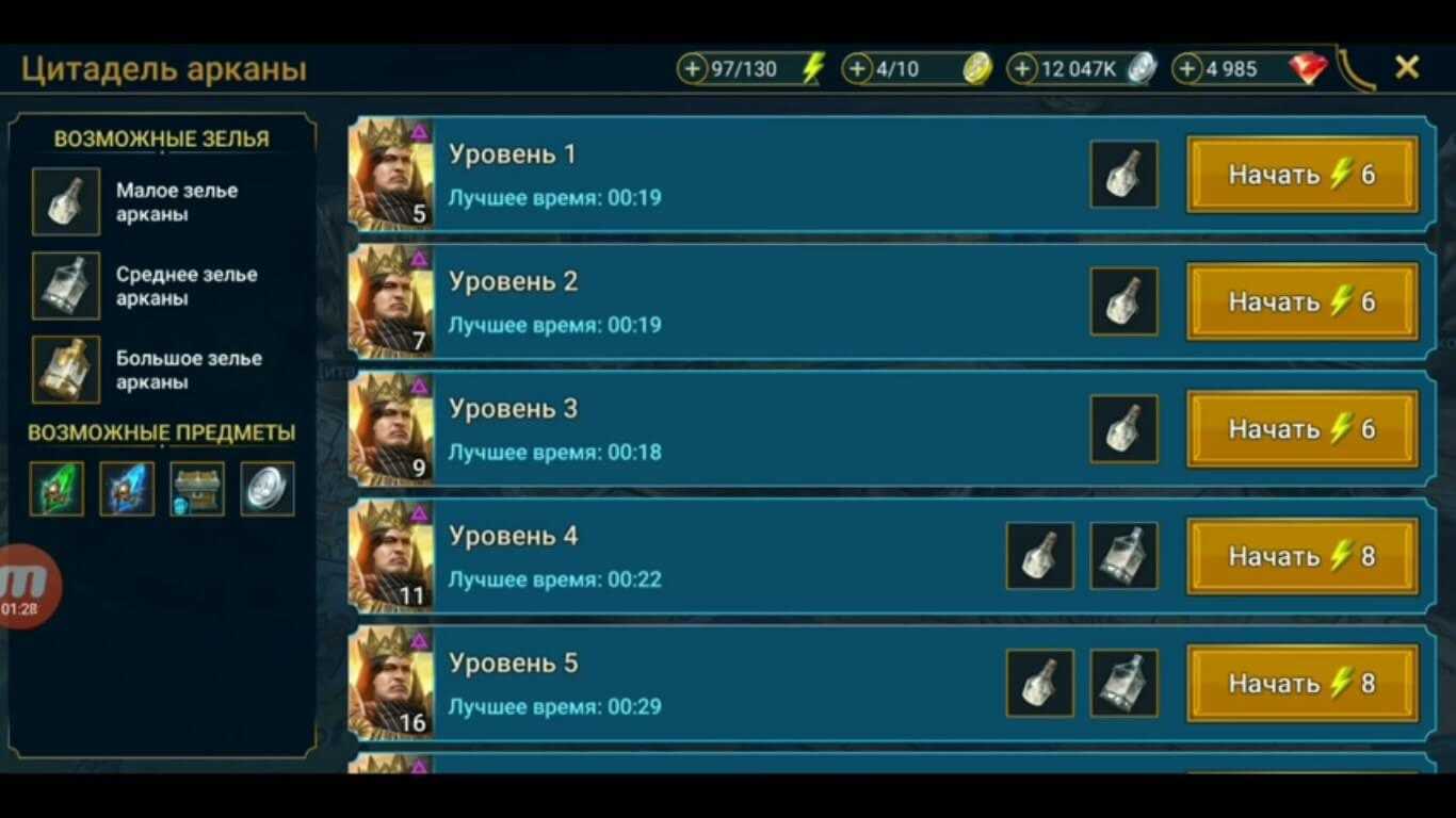 Всего 5 локаций. Список: Цитадель Арканы, Магии, Духа, Тьмы, Силы. Для новичков, в первую неделю открыты все цитадели, далее открываются по расписанию. Открывается нужная цитадель за 200 рубинов, но это крайне не рекомендуется новичкам.