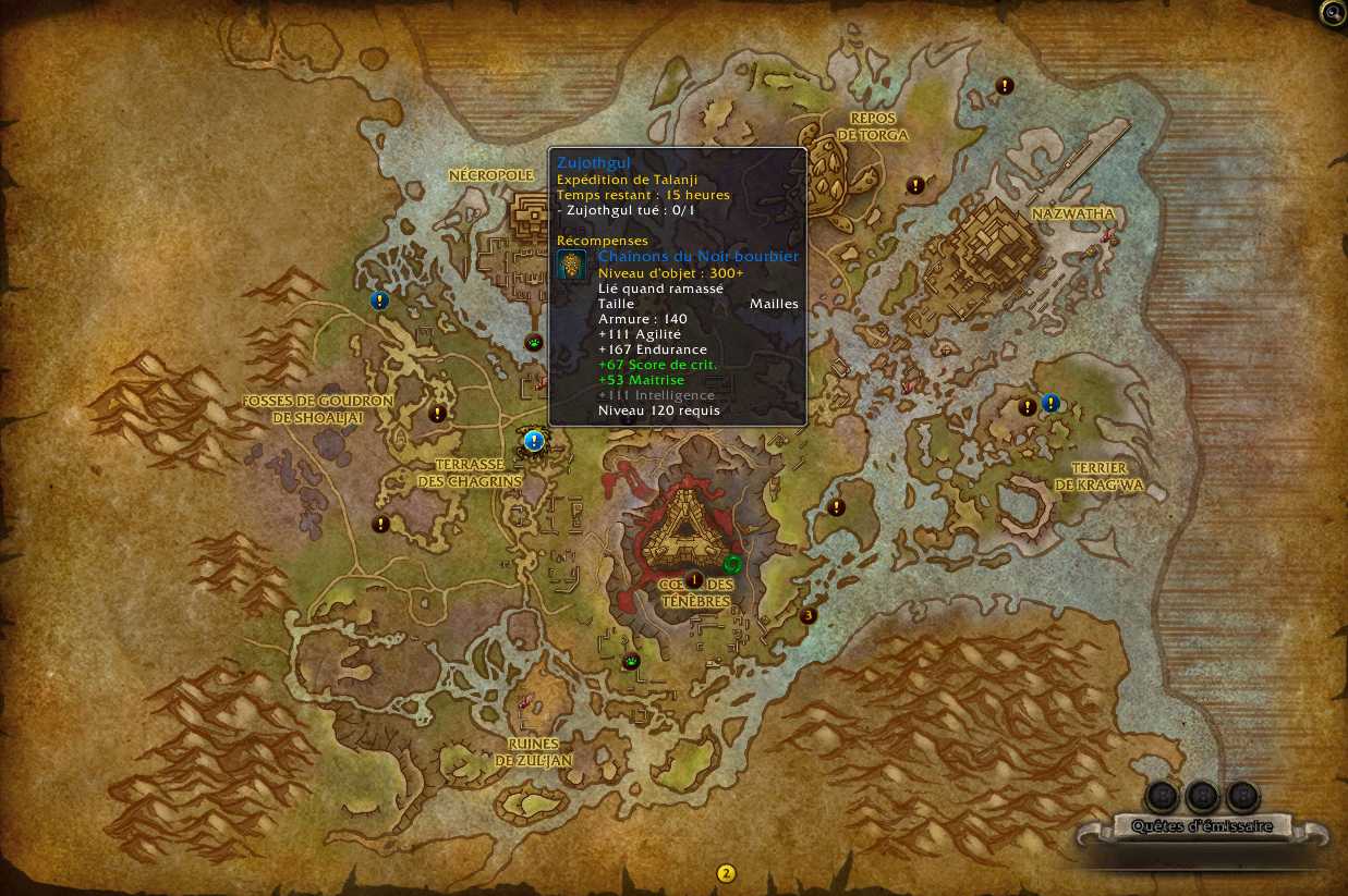 De nombreuses quêtes de Nazmir permettent d’améliorer votre réputation auprès de l’Expédition de Talanji. Les quêtes vous rapportent de manière générale entre 10 points et 350 points de réputation. En réalisant la totalité des quêtes et sans utiliser de bonus, vous pouvez atteindre facilement le rang Honoré.