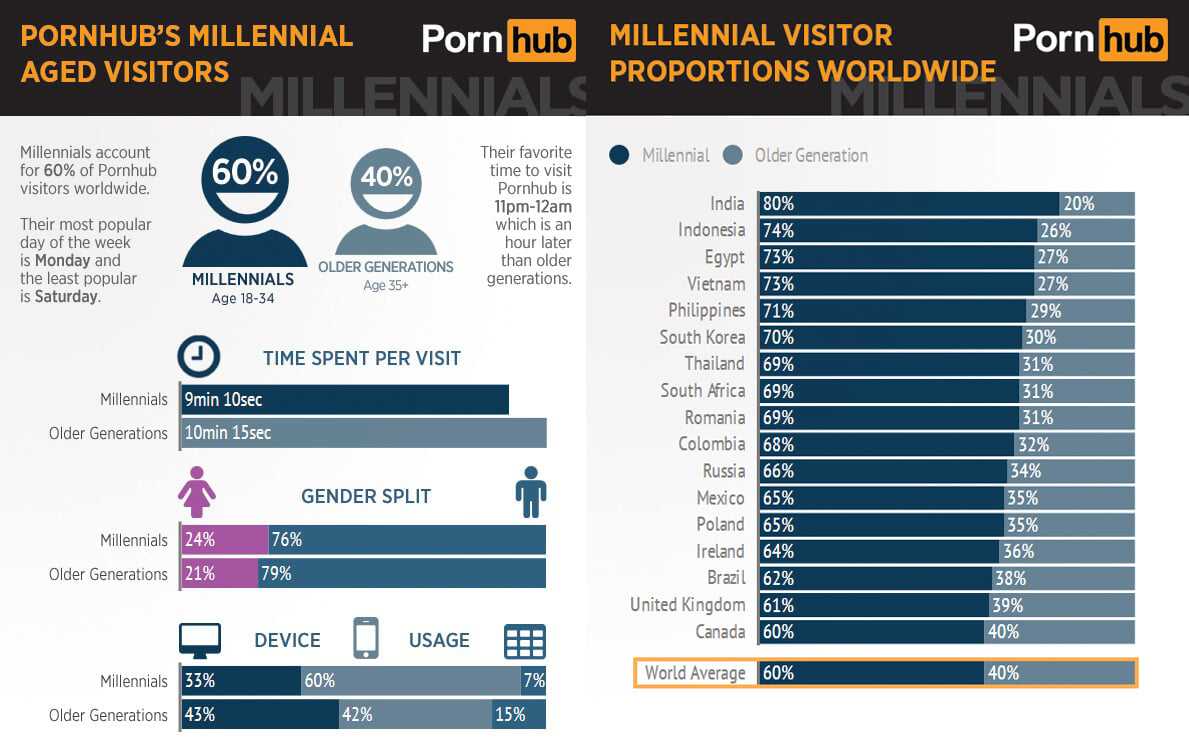 По данным PornHub, рисованная порнография привлекает молодых людей в возрасте от 18 до 34. Американский психолог Леон Ф. Зельцер, исследуя интерес миллениалов, пришел к выводу, что дело в доступности экзотических фетишей: «В хентае подростки видят нестандартные вещи: женщины, у которых резко отрастают пенисы, антропоморфных животных, изнасилование и инцесты. Законы большинства стран не отождествляют рисованную порнографию с реальной, так что встречается даже вымышленные несовершеннолетние персонажи. Такое недоступно в реальной жизни, и в итоге появляются «особые» вкусы – настоящее порно становится скучным».