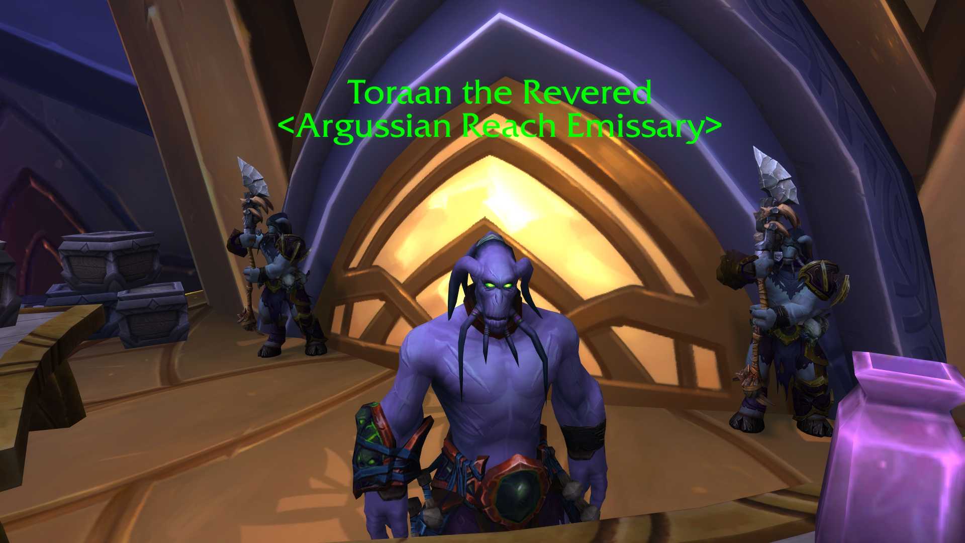 Интенданта Защитников Аргуса зовут Тораан Достопочтимый . Его можно найти в Виндикааре, по координатам 68, 56. В качестве оплаты он принимает золото, для покупки некоторых предметов требуется определенный уровень репутации. На все цены распространяются фракционные скидки.