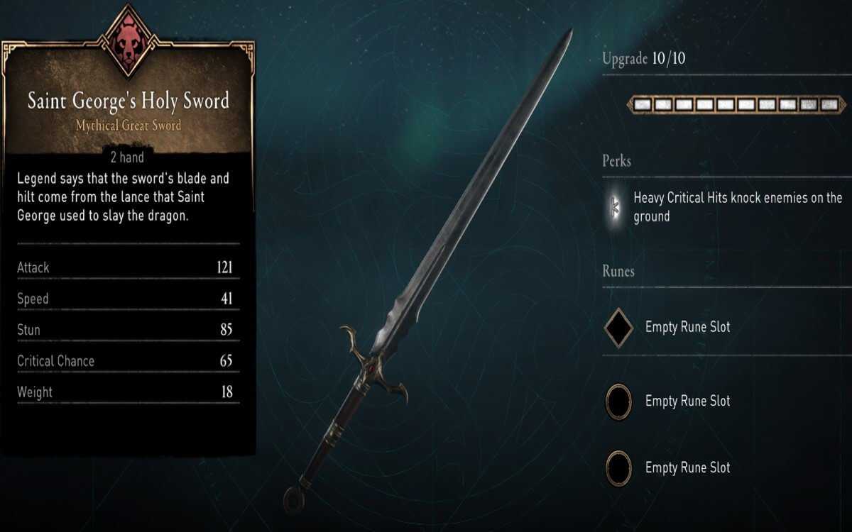 One of the newer additions to Eivor’s arsenal of melee weapons is Saint George’s Holy Sword. It made its way into the game with the River Raids update back in February.