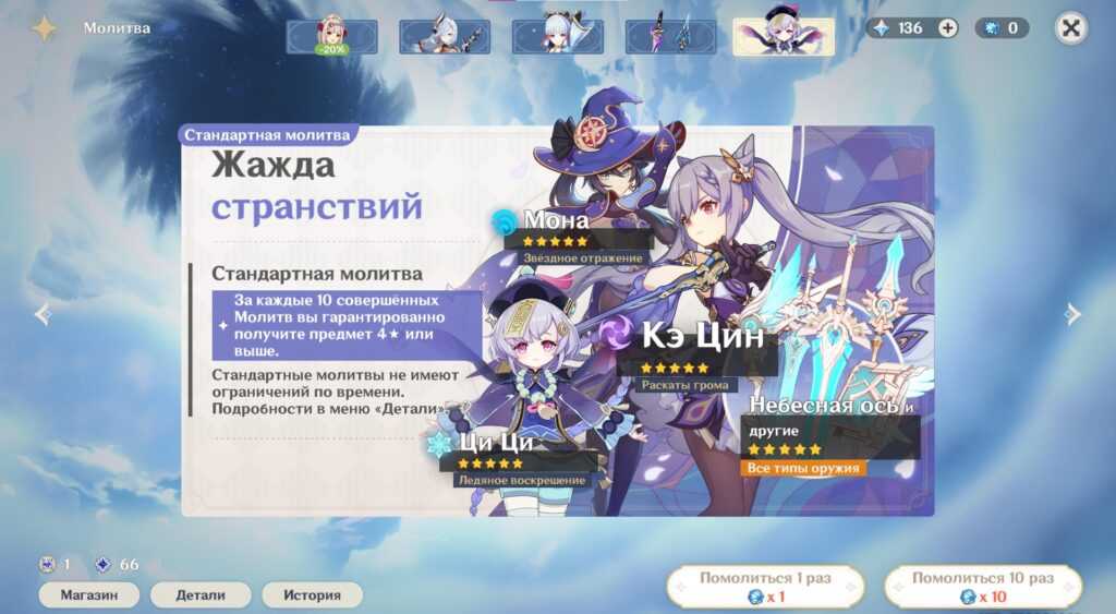 Стандартные молитвы в Genshin Impact представлены баннером Жажда странствий. Используя судьбоносные встречи, вы можете выбить: