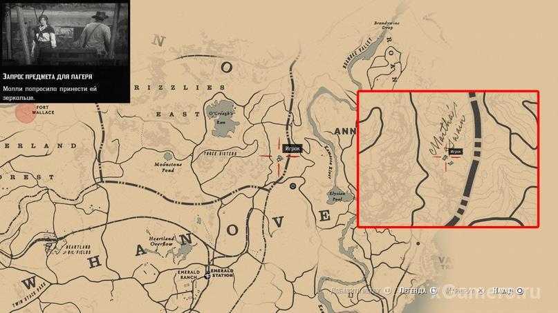 Еще одна представительница прекрасного пола — Молли попросит найти ей маленькое карманное зеркальце. Девушки остаются девушками даже будучи в составе банды. За предметом нужно пройти к северо-востоку от ранчо Эмеральд. Вам придется найти захудалый домишко. В спальне будет стоять прикроватная тумбочка. На ней в художественном беспорядке разложены металлическая кружка, свеча в подсвечнике и фляга, завалившаяся на бок (наверное от усталости). Среди этих, безусловно полезных для засыпающего предметов, и будет лежать маленькое зеркальце. Его миниатюрность может сыграть с игроком плохую шутку: добравшись до места, Артур может просто упустить из виду такую небольшую деталь.