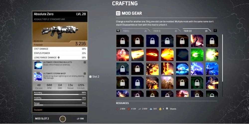 Моды дают пассивные улучшения, которые можно устанавливать на оружие и броню. Чтобы вставлять имеющиеся улучшения в снаряжение, нужно сначала разобрать предмет. После этого он будет доступен неограниченное количество раз.