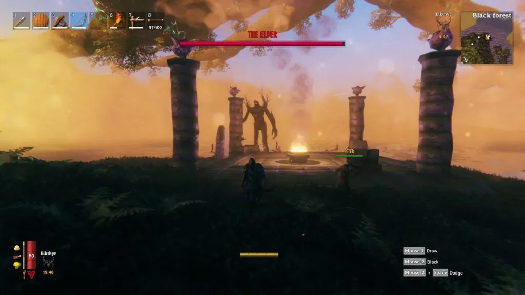 Второй босс Валхейма – Старейшина, похожий на свирепую версию Грута из вселенной Marvel. Вызвать его можно, сжегши три древних семени на алтаре в Шварцвальде. В чаше с огнем у алтаря вы увидите камень с руной, на котором написано “Сожги их молодых”. Старейшина также вызывает несколько корней, которые могут нанести урон, если подойти слишком близко. Посмотрите как победить старейшину в нашем руководстве по бою с боссом.
