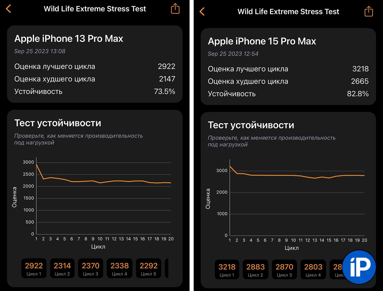 Поэтому мы прокатали iPhone 15 Pro Max через стресс-тест 3D Mark Wild Life Extreme. Его суть – 20 одинаковых тестов 3D-производительности друг за другом, без остановки. На основе результатов формируется график «устойчивости» – то есть того, как смартфон выдерживает постоянную и длительную графическую нагрузку.