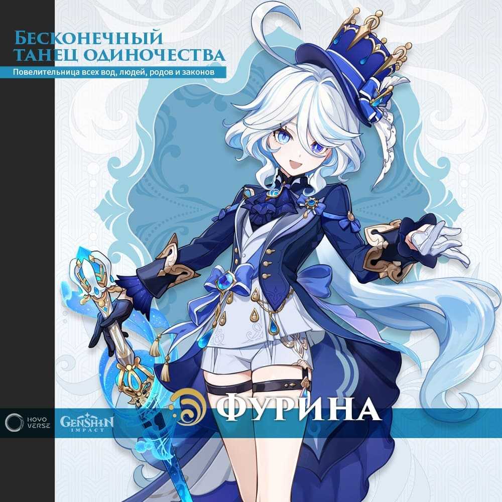 Фурина – Повелительница всех вод, людей, родов и законов, Гидро-Архонт на данный момент. 5-звездочная Гидро-мечница. Универсальный персонаж, способный и наносить урон, и исцелять – ее стиль игры меняется через Заряженную атаку (в одном виде помощники наносят урон, в другом – лечат), урон и хилл зависят от макс. HP. Во время е-шки может ходить по воде.