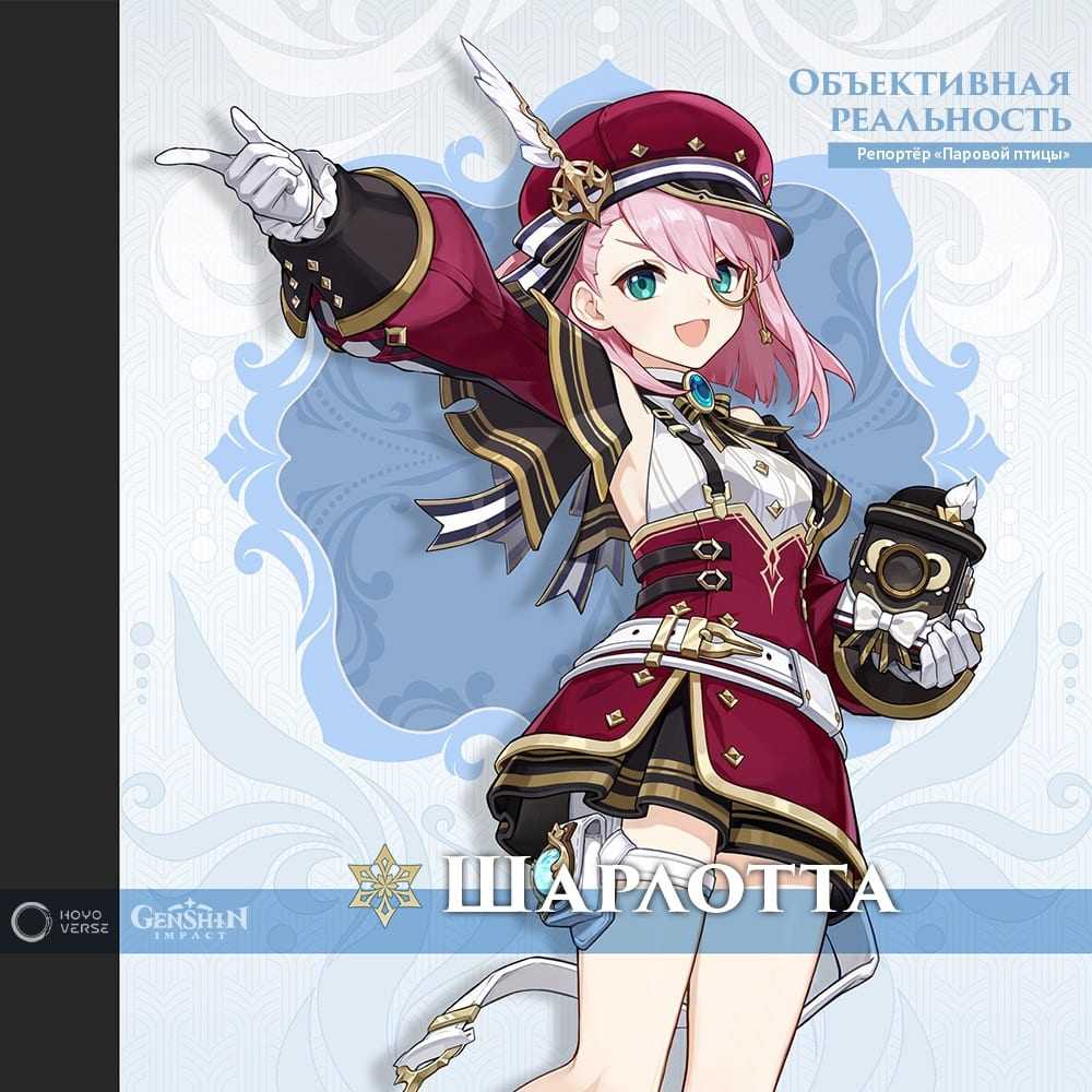 Шарлотта – Репортёр «Паровой птицы». 4-звездочная Крио-каталистка. Персонаж поддержки, может наносить Крио-урон и исцелять. Имеет необычные механики атак – они сделаны в виде фотоаппарата, подобно навыку Нахиды.
