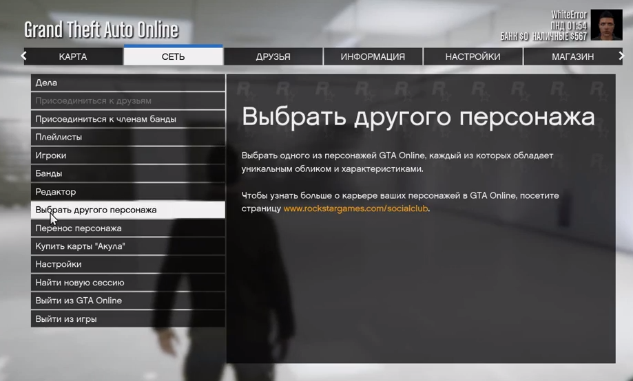 Там вы найдете пункт «выбрать другого персонажа». Нажмите здесь.