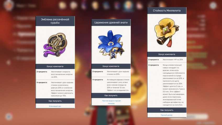 Добавьте две части Millelite Fortress к двум частям эмблемы, и вы получите сбалансированную сборку артефактов для чистых характеристик: + 20% восстановления энергии и + 20% HP. Это принесет пользу всему отряду.Если вы еще не на высоком уровне и не можете фармить 5 * сетов, Том также сделает набор инструктора, если вы используете его в отряде, основанном на элементальной реакции.