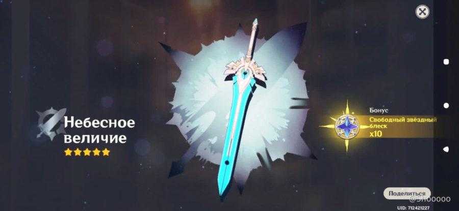 | Второе место | Небесный меч | Базовые характеристикиБазовая атака: 46Бонусный эффект: Восст. энергии 12%ЭффектУвеличивает шанс крит. попадания на 4%. Взрыв стихии пробуждает силу небес, которая увеличивает скорость передвижения и атаки на 10%, а обычные и заряженные атаки при попадании наносят дополнительные 20% урона. Все эффекты длятся 12 сек. |