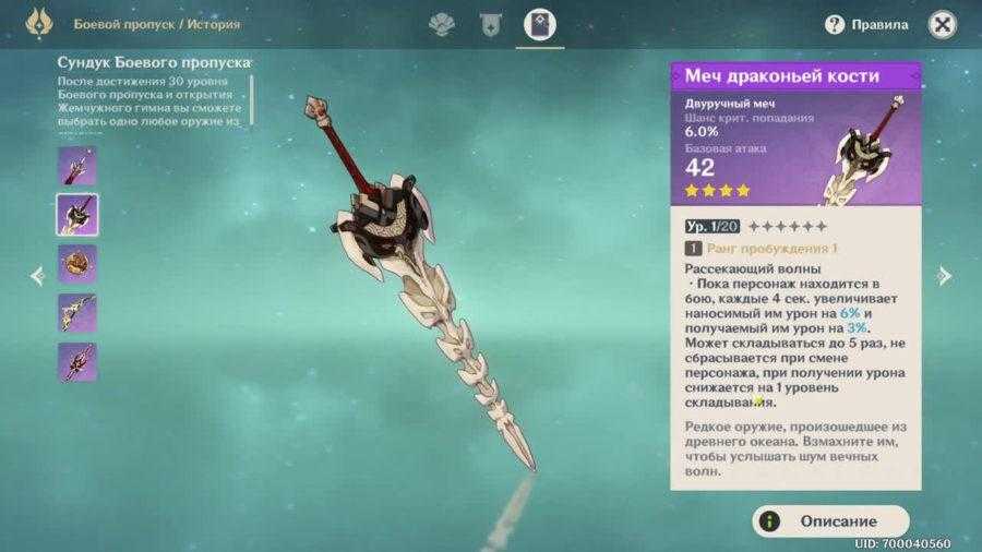 Как и все остальное оружие в боевом пропуске, меч из кости дракона — отличное оружие просто из-за его критического шанса. А для роли Главного ДД это просто навороченное оружие. И дело не только в том, что бонус к урону очень большой, он увеличивает весь урон, решая проблему некоторых персонажей, которым приходится выбирать между физическим и стихийным уроном. Если вы беспокоитесь, что эту способность будет слишком сложно поддерживать, то не стоит: на практике у вас всегда будет ~3 пассивных стака. Ее не так просто сбить с ног, так как вы не можете потерять более одного стека за короткий промежуток времени.