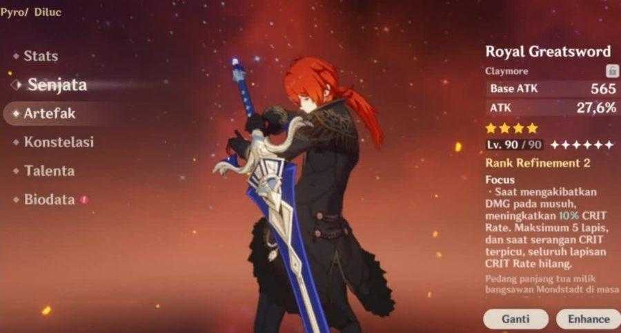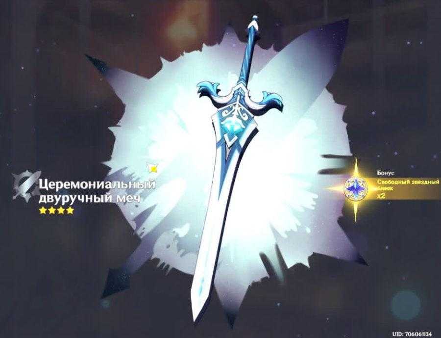 Требует использования базовых или заряженных атак, то есть он подходит только для наносящих основной урон. Тем не менее даже без этой способности двуручное оружие хорошо для любого персонажа из-за его очень высоких базовых характеристик, в том числе одного из самых высоких базовых показателей атаки в игре.