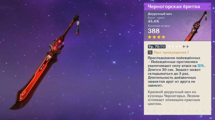 Blackcliff Slasher: Blackcliff Slasher — это оружие, направленное на увеличение критического урона Итто. Его пассивная способность Press the Advantage увеличивает критический урон на 20% на 30 секунд после победы над противником. Высокая базовая атака и повышенный критический урон этого оружия могут значительно увеличить урон Итто, особенно в сочетании с другими бонусами к критической скорости и урону.