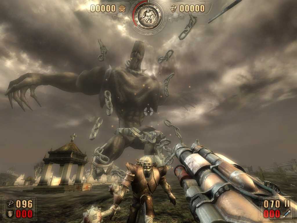 Тридцатиметровый Некрогигант из Painkiller возвышается над нами башенным краном. Достаточно бить его всем, что есть в арсенале, — тогда и упадет.  |
