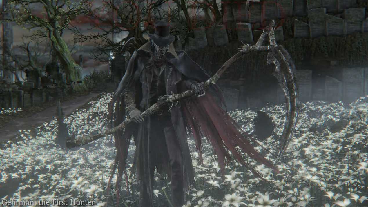 Беда же его — в том, что это третий по счёту босс-охотник… и он, в общем, такой же, как два других, разве что летает иногда (но это мало что меняет). Кроме того, его боевой облик — в цилиндре, вампирском плаще и с косой — кажется мне слишком анимешным и почти пошлым: образ вышел бы куда ярче, сражайся Герман всё в той же задрипанной курточке, в которой сидел на кресле и которая потом достанется нам.
