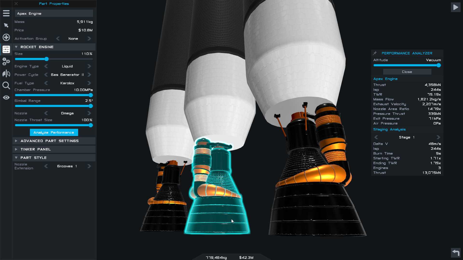 - Полностью настраиваемые детали: Игра предлагает всего около двух десятков деталей, но настраивается в них буквально всё – от формы и веса до цвета и плавучести. Например, двигатели в игре представлены в виде нескольких базовых камер сгорания, настраивая размер, тип топлива, форму сопла которых можно получить тысячи комбинаций двигателей на все случаи жизни. Созданные в редакторе отдельные узлы можно сохранять в ассеты для дальнейшего использования в других конструкциях.