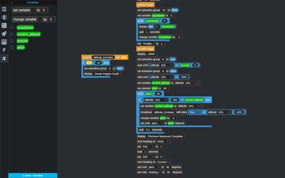 - Программирование: Это единственная игра в своём жанре, имеющая на борту собственный язык визуального программирования Vizzy. Vizzy при наличии определённых навыков позволяет автоматизировать всё – от запуска ракеты до стыковки и посадки на другие планеты. Конечно, в KSP тоже можно запрограммировать полёт, но в нём сделать это без модов невозможно.