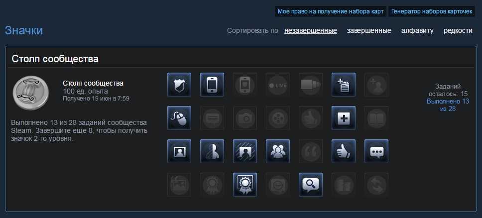 Этот способ отлично подойдёт для новичков в сервисе. У Steam существует список заданий, всего их порядка тридцати. Если выполнить их все или половину, вам дадут особые бейджи, которые, соответственно, приносят разное количество ОО.