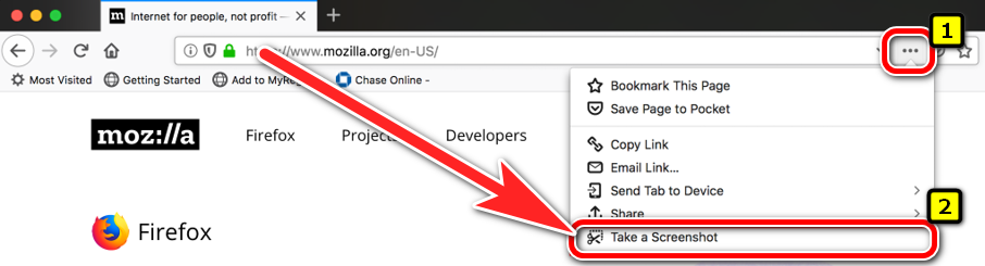 В Firefox тоже есть собственный интегрированный «скриншотер». Его даже активировать не нужно, как в «Яндекс». Функция актуальна только для Firefox 70-й версии и более новой. Всё, что потребуется — это кликнуть на иконку дополнительных опций и нажать «Take a Screenshot».